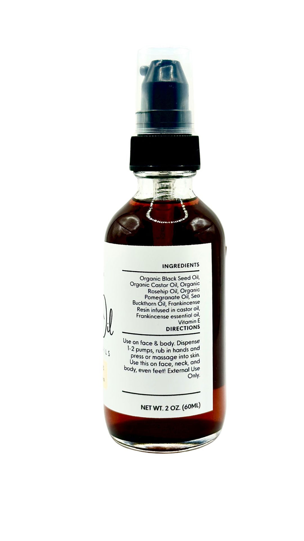 Get ready to elevate your self-care routine with our exquisite organic cold-pressed oil blend! This magical elixir, handcrafted in small batches, is a luxurious fusion of organic Castor Oil, Black Seed Oil, Rosehip Oil, Pomegranate Oil, Sea Buckthorn Oil, Frankincense Rivae Resin, and Vitamin E. The systemic carrier properties of Castor Oil allow deep penetration below the epidermis, carrying the other potent oils and nutrients below the skin's surface to work their wonders. The Frankincense resin which contains the boswellic acid is infused into the castor oil.  The boswellic acid is where all the magical benefits of frankincense lie.
